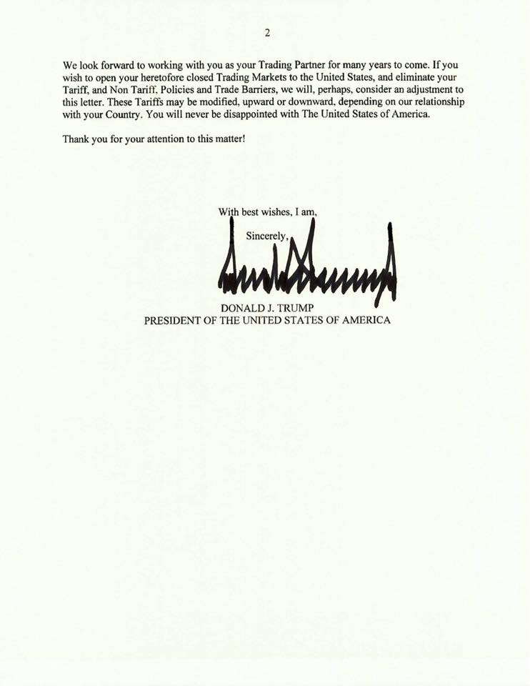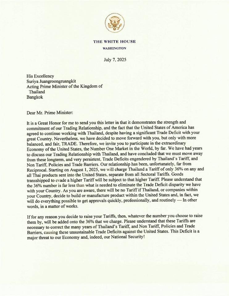 เราหวังว่าจะได้ทำงานร่วมกับท่านในฐานะพันธมิตรทางการค้าต่อไปอีกหลายปี หากประเทศไทยประสงค์จะเปิดตลาดการค้าที่เคยปิดไว้ต่อสหรัฐฯ และยกเลิกนโยบายกำแพงภาษี รวมถึงมาตรการกีดกันทางการค้าอื่นๆ เรา อาจ พิจารณาปรับเงื่อนไขในจดหมายฉบับนี้ ทั้งนี้ อัตราภาษีดังกล่าว สามารถปรับเพิ่มหรือลดได้ ขึ้นอยู่กับความสัมพันธ์ระหว่างประเทศของเรา