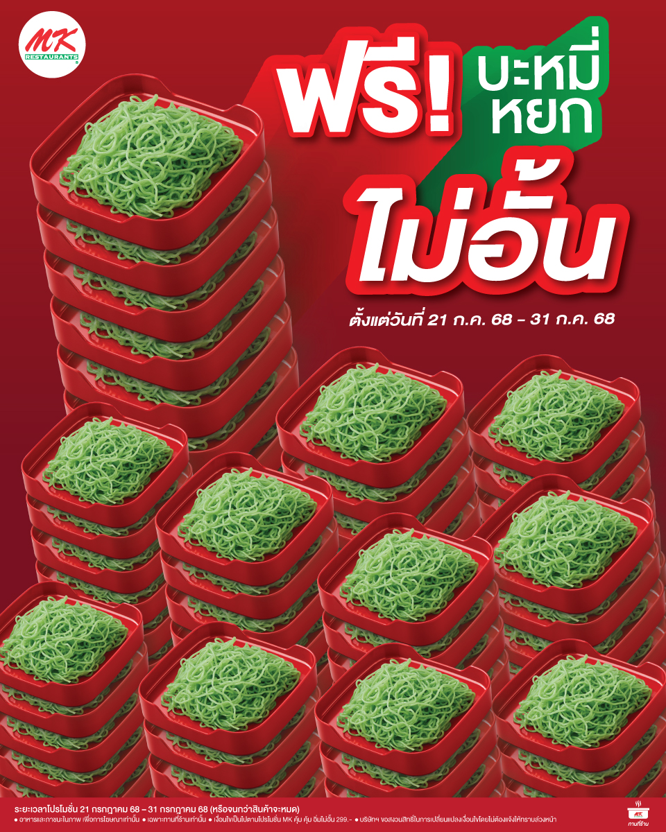 ล่าสุด MK Restaurants เดินหน้าต่อเนื่องอัปเกรด โปรแรง ให้ฟินกว่าเดิม โปรพิเศษให้ลูกค้าได้สั่งเพิ่มง่ายๆ แค่ทานโปร MK อิ่มไม่อั้น 299.- ก็รับสิทธิ์สั่งบะหมี่หยกได้ไม่อั้น จะมาคนเดียว หรือมากี่คนก็สั่งบะหมี่หยกได้ไม่อั้น รีบหน่อยนะคร้าบบบบ โปรพิเศษนี้เอาใจคนรักบุฟเฟต์ และหมี่หยกเลย ระยะเวลากิจกรรม 21 ก.ค. 68 – 31 ก.ค. 68 รวม 299 สาขา
