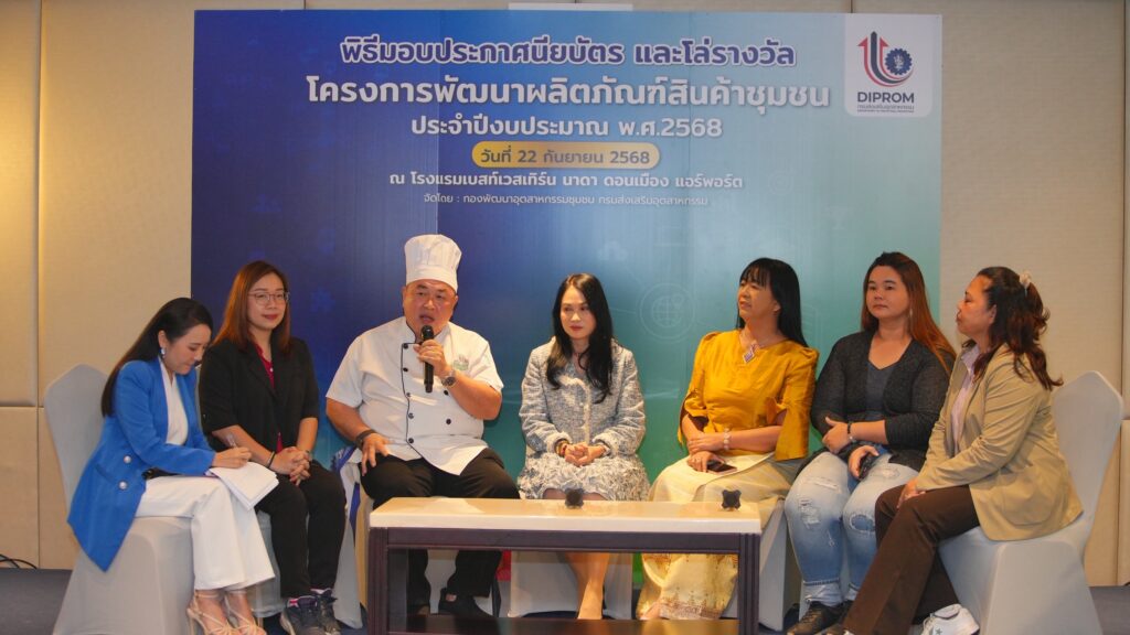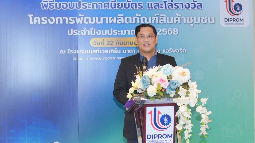 กองพัฒนาอุตสาหกรรมชุมชน กรมส่งเสริมอุตสาหกรรม มอบประกาศนียบัตรและโล่รางวัลแก่ผู้ประกอบการดีเด่นที่ผ่านการคัดเลือก ภายใต้โครงการพัฒนาผลิตภัณฑ์สินค้าชุมชน กับกิจกรรม “DIPROM : Pitching Bootcamp 2568 พลิกเกมธุรกิจชุมชน สู่ตลาดยุคใหม่” ด้วยหลักสูตรเข้มตลอด 4 วันเต็ม กับองค์ความรู้เชิงลึกครบเครื่อง เสริมศักยภาพผลิตภัณฑ์ชุมชนไทยให้ยกระดับพร้อมเติบโตไกล จำนวน 6 สาขา รวม 250 ผลิตภัณฑ์ ตั้งเป้าเดินสายอบรม 4 ภูมิภาคทั่วประเทศรวมทั้งสิ้น 1,000 กิจการ