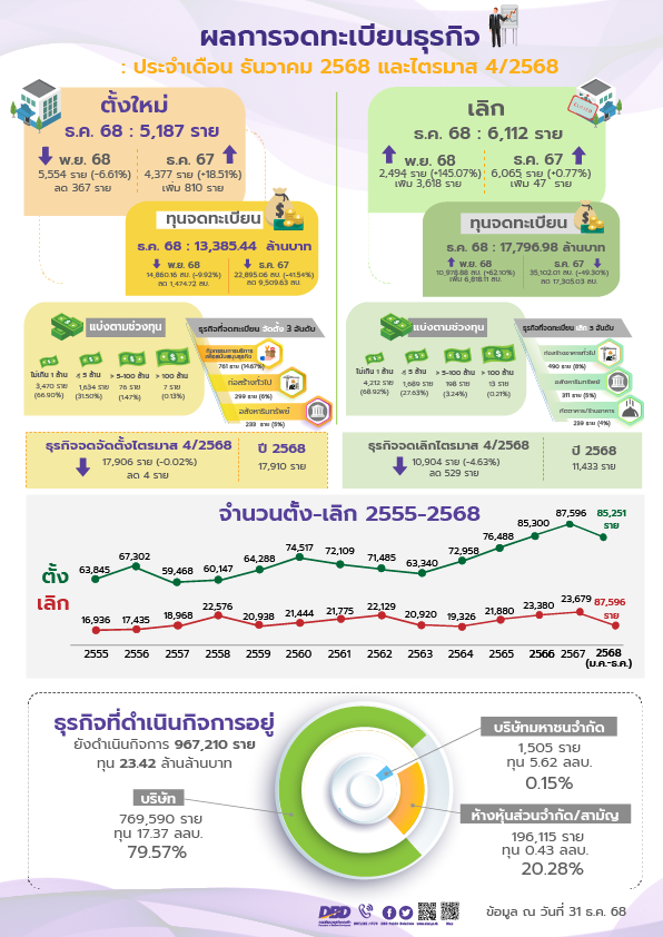 กรมพัฒนาธุรกิจการค้า เผยภาพรวมการจดทะเบียนจัดตั้งธุรกิจตั้งใหม่เดือน ธ.ค. 68 และตลอดปี 68 โดย ธ.ค. 68 มีการจัดตั้งธุรกิจใหม่ 5,187 ราย เพิ่มขึ้น 18.51% เมื่อเทียบกับช่วง ธ.ค. 67