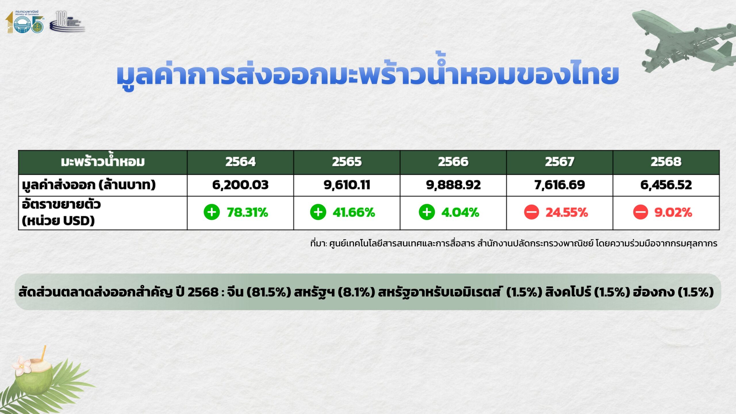 กรมพัฒนาธุรกิจการค้า แจงรายละเอียดห่วงโซ่อุปทานมะพร้าวน้ำหอมไทย ส่งผลราคาผันผวนหนัก เปิดแนวทางการแก้ปัญหาระยะสั้น-กลาง กระตุ้นราคามะพร้าวน้ำหอมอยู่เหนือจุดคุ้มทุน เร่ง!! รักษาตลาดส่งออกเดิม เพิ่มเติมตลาดใหม่ ฟื้นฟูตลาดเก่า ลดการผูกขาด พร้อมชวนรักษามาตรฐาน มะพร้าวน้ำหอมไทยไซต์มาตรฐานมากขึ้น ขณะที่ไซต์ต่ำมาตรฐานต้องเน้นแปรรูป โดยนำน้ำมะพร้าวน้ำหอมมาแปรรูปสร้างมูลค่าเพิ่ม