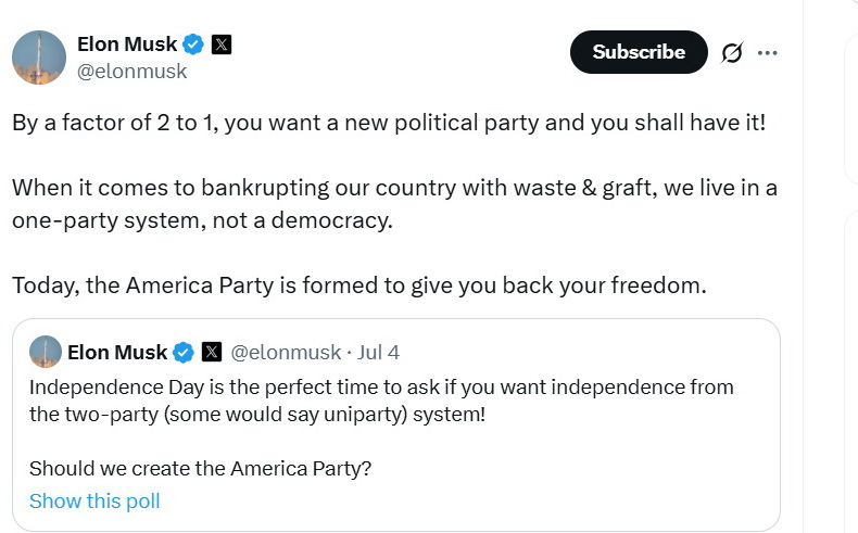 มัสก์ โพสต์ผ่าน X ว่า เมื่อพูดถึงการทำให้ประเทศของเราล้มละลายด้วยการทุจริต และคอร์รัปชัน เราอาศัยอยู่ในระบบพรรคการเมืองเดียว ไม่ใช่ประชาธิปไตย พรรคอเมริกันถูกจัดตั้งขึ้นเพื่อคืนอิสรภาพให้กับคุณ