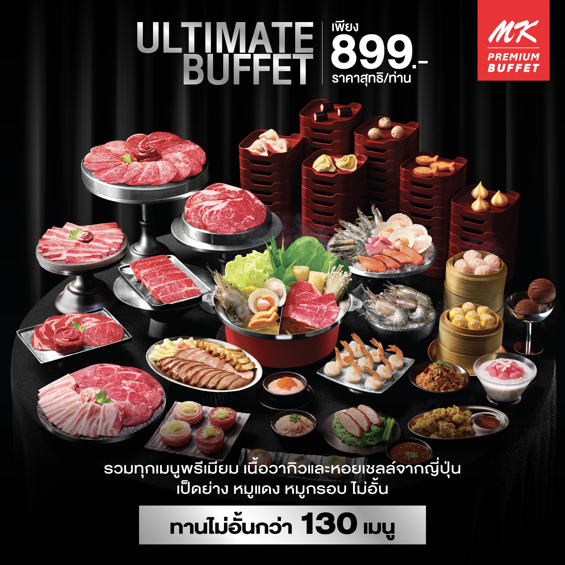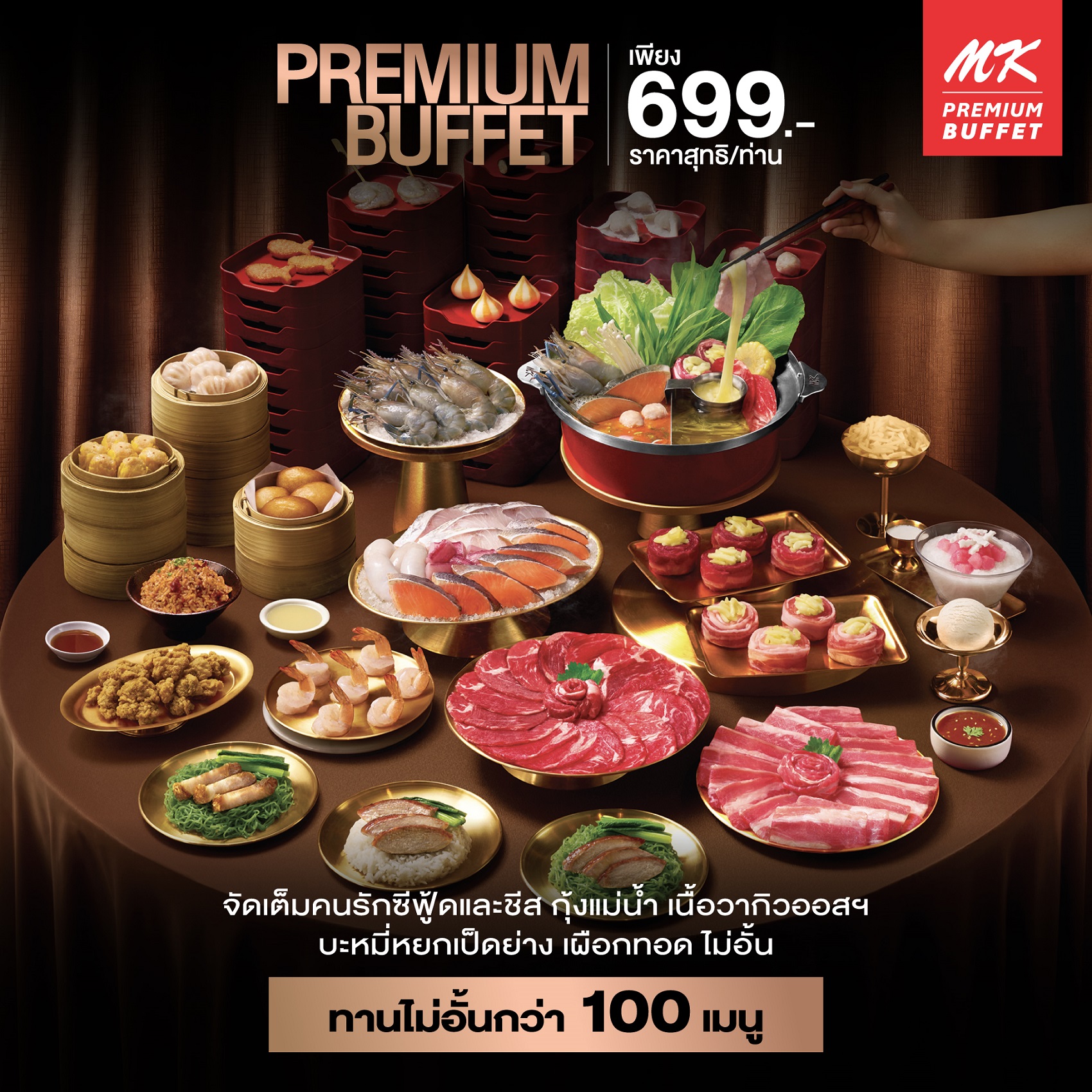 Premium Buffet: รับประทานได้กว่า 100 เมนู เช่น ซีฟู้ดและชีส กุ้งแม่น้ำ เนื้อวากิวออสฯ บะหมี่หยกเป็ดย่าง เผือกทอดราคา 699/คน