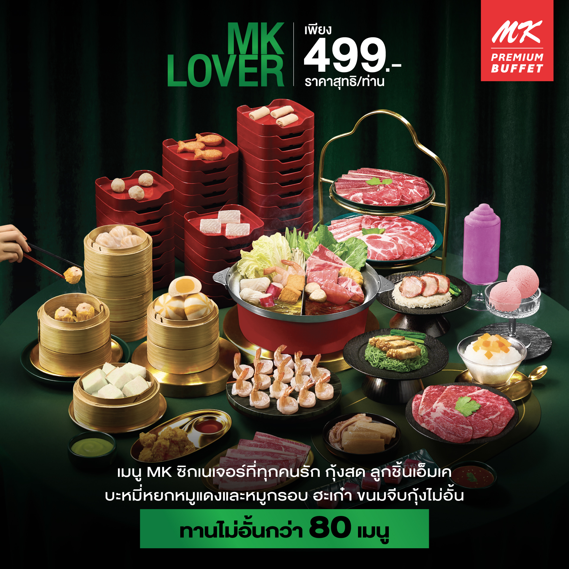 MK Lover: รับประทานได้กว่า 80 เมนู เช่น กุ้งสด ลูกชิ้นเอ็มเค บะหมี่หยกหมูแดงและหมูกรอบ ฮะเก๋า ขนมจีบกุ้ง เป็นต้น ราคา 499 บาท/คน