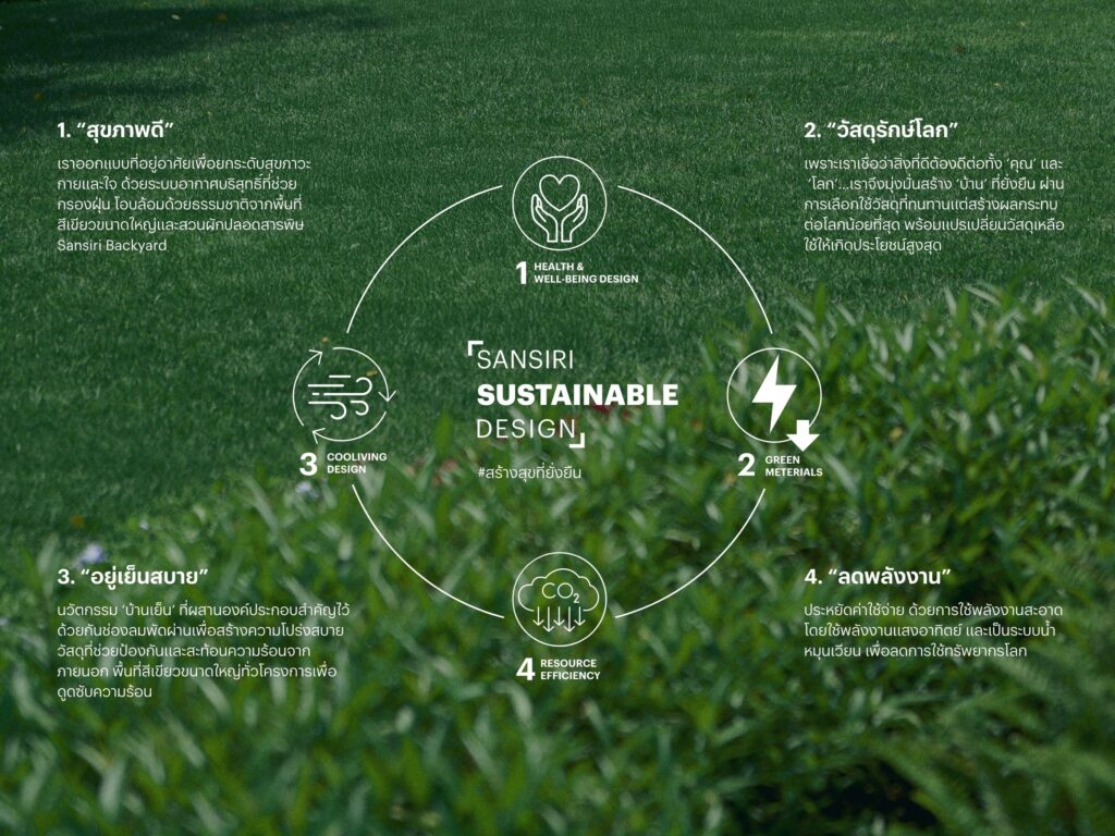 จึงนำมาสู่แนวคิดที่สำคัญคือ “Sansiri Sustainable Design” การพัฒนาการออกแบบและส่งมอบที่อยู่อาศัยของแสนสิริ ซึ่งเป็นบ้านที่เต็มไปด้วยนวัตกรรมเพื่อสิ่งแวดล้อม ประหยัดพลังงาน และรองรับการอยู่อาศัยและคุณภาพชีวิตของลูกบ้านอย่างดีที่สุดในทุกมิติ จึงเกิดเป็นแคมเปญ “Sustainable Happiness: สร้างสุขที่ยั่งยืน” เพื่อให้ผู้บริโภคได้สัมผัสถึงนิยามใหม่ของการอยู่อาศัยที่มากกว่า “ที่อยู่” แต่คือการ “ใช้ชีวิต” ที่แข็งแรง มีความสุข และใส่ใจต่อโลกในระยะยาวได้ ผ่านแนวคิดการออกแบบที่เน้นการเลือกใช้วัสดุที่เป็นมิตรต่อสิ่งแวดล้อม เทคโนโลยีที่ช่วยประหยัดพลังงาน การออกแบบที่สอดคล้องกับสภาพอากาศและวิถีชีวิตไทย”