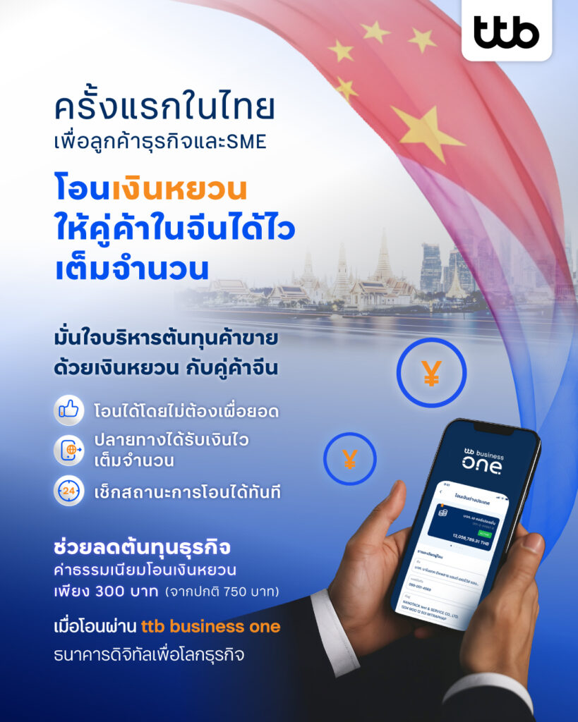- บริการโอนเงินไปต่างประเทศ ทีทีบี ครั้งแรกในไทยที่ธุรกิจโอนเงินหยวนให้คู่ค้าในจีนได้ไว เต็มจำนวนครบทุกหยวน ไม่มีหักปลายทาง ไม่ต้องเผื่อยอดโอน เมื่อโอนเงินสกุลหยวนไปจีนผ่านช่องทาง ttb business one ค่าธรรมเนียมการโอนเพียง 350 (จากปกติ 750 บาท)