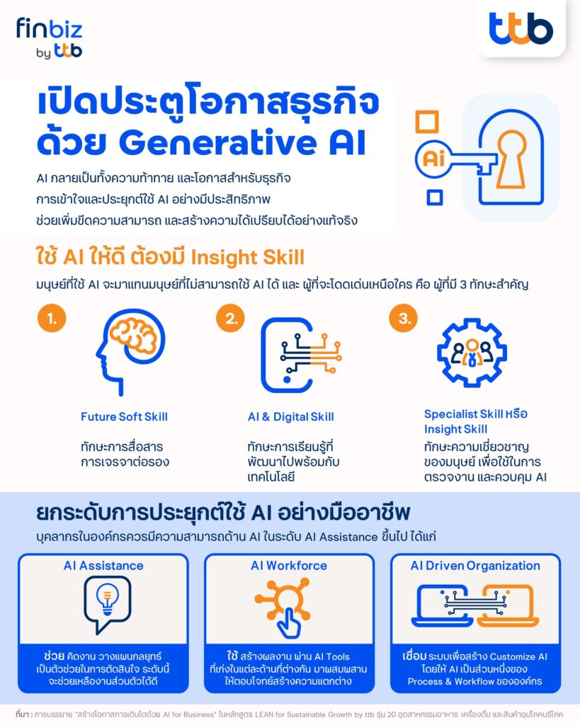 ในยุคที่เทคโนโลยีเปลี่ยนแปลงอย่างรวดเร็ว โดยเฉพาะ AI ที่กลายเป็นความท้าทายและโอกาสของเจ้าของธุรกิจ finbiz by ttb จึงขอแนะแนวทางการประยุกต์ใช้ AI ที่จะช่วยให้ธุรกิจใช้ขีดความสามารถของ AI ได้อย่างมีประสิทธิภาพ ซึ่งการใช้ AI ให้ดี ต้องมี Insight Skill