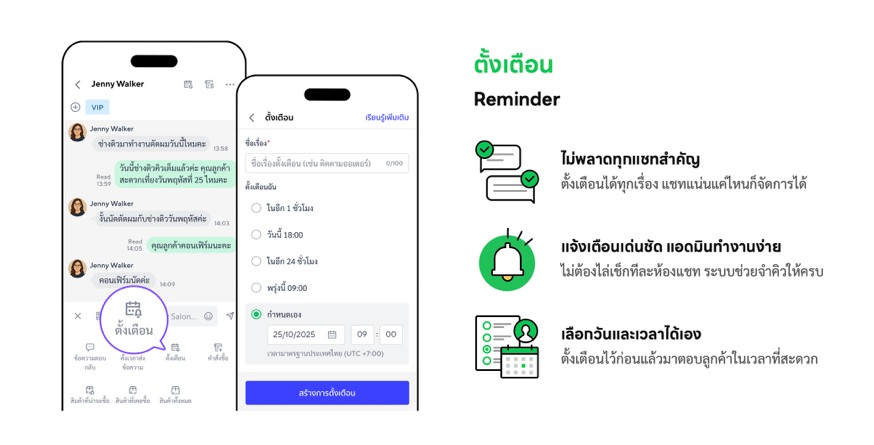 ไม่ว่าจะเป็นแอดมินคนไหนก็ไม่พลาดทุกแชทสำคัญ เสมือนมีผู้ช่วยจัดลำดับงานและการติดตามลูกค้าให้อย่างเป็นระบบ โดยฟีเจอร์นี้สามารถตั้งเวลาแจ้งเตือนอัตโนมัติให้แอดมินกลับมาตอบลูกค้าแต่ละคนได้ตรงตามความตั้งใจหรือไทม์ไลน์ที่วางไว้ เช่น เตือนให้แอดมินแจ้งยืนยันการจองคิว ติดตามออเดอร์ หรือปิดการขายกับลูกค้าแต่ละคนให้สมบูรณ์ได้ โดยไม่ต้องไล่เช็กทีละห้องแชทให้เสียเวลา รวมทั้งยังเลือกวันและเวลาที่ต้องการแจ้งเตือนได้เอง ช่วยให้แอดมินไม่ตกหล่นทุกการสื่อสารสำคัญไป ทำงานต่อเนื่องง่าย ได้คุณภาพระดับมืออาชีพ