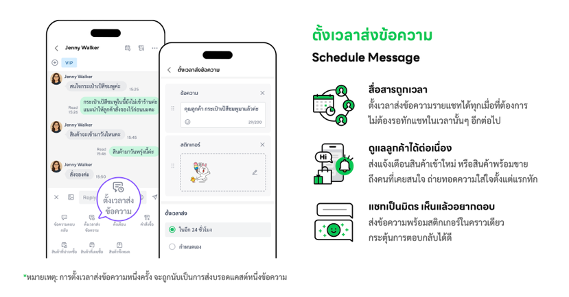 ร้านค้าสามารถตั้งวันและเวลาในการส่งข้อความหาลูกค้าล่วงหน้าแบบรายคนได้ ช่วยให้แอดมินสื่อสารกับลูกค้าได้ทันเวลา ตรงใจ และต่อเนื่องมากยิ่งขึ้น ไม่ว่าจะเป็นการแจ้งเตือนสินค้าใหม่ สินค้าพร้อมขาย หรือโปรโมชันพิเศษถึงลูกค้าที่เคยสนใจ แสดงถึงการดูแลใส่ใจในการขาย ไม่พลาดการให้ข้อมูลที่ลูกค้าแต่ละคนรอคอยได้อย่างตรงจังหวะ นอกจากนี้ยังสามารถแนบสติกเกอร์ส่งไปพร้อมกันเพื่อเพิ่มความเป็นมิตรในการสื่อสาร ช่วยเพิ่มโอกาสในการปิดการขายและสร้างความสัมพันธ์ระยะยาวกับลูกค้า ทั้งนี้ การส่งข้อความจากการใช้ฟีเจอร์ตั้งเวลาส่งหนึ่งครั้ง จะถูกนับเป็นการส่งบรอดแคสต์หนึ่งข้อความ