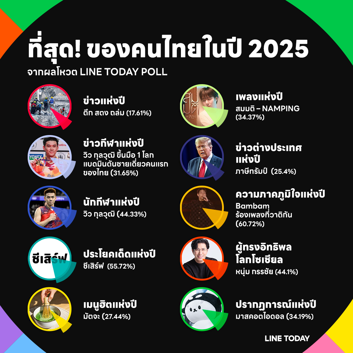 โดยตลอดทั้งปี LINE TODAY ยังคงทำหน้าที่เป็น “ศูนย์รวมทุกเรื่องราวแห่งปี” ที่บันทึกความเปลี่ยนผ่านของสังคมไทยไว้ครบทุกมิติ พร้อมจัดทำ LINE TODAY POLL OF THE YEAR 2025 โพลแห่งปี ที่เปิดเป็นสาธารณะให้มหาชนออนไลน์ ร่วมโหวต ในช่วงวันที่ 1-30 พฤศจิกายน 2568 ที่ผ่านมา ด้วยคะแนนโหวตรวมกว่า 1.2 ล้านคะแนน
