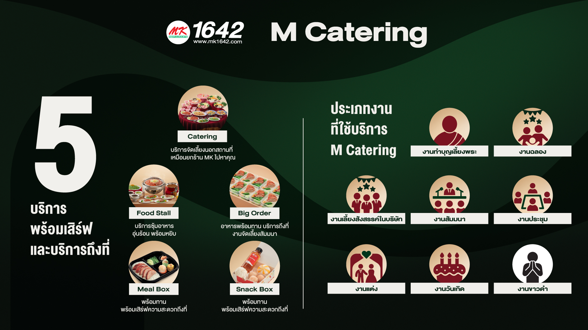 “M Catering” ชูคอนเซปต์ มากกว่าสุกี้ บริการถึงที่ ทุกโอกาส เน้นเสิร์ฟประสบการณ์งานเลี้ยงที่ครบกว่า สะดวกกว่า คุณภาพเต็มรูปแบบ ด้วยรสชาติแบบ MK ที่ทุกคนไว้ใจ, วัตถุดิบสดใหม่, คุณภาพมาตรฐาน และทีมงานมืออาชีพแบบ Full Service พร้อมตัวเลือกบริการได้ตามงบ และไลฟ์สไตล์