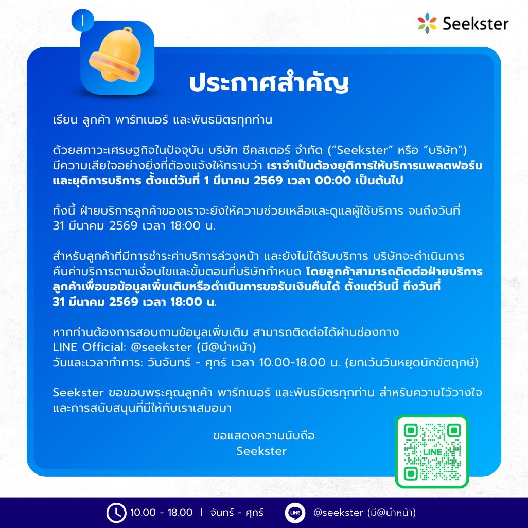 ด้วยสภาวะเศรษฐกิจในปัจจุบัน ประกอบกับการแข่งขันที่รุนแรงในตลาดธุรกิจการให้บริการออนไลน์ Seekster มีความเสียใจอย่างยิ่งที่ต้องแจ้งให้ทราบว่า เราจำเป็นต้องยุติการให้บริการแพลตฟอร์ม และยุติการรับคำสั่งซื้อบริการ ตั้งแต่วันที่ 1 มีนาคม 2569 เวลา 00:00 น. เป็นต้นไป