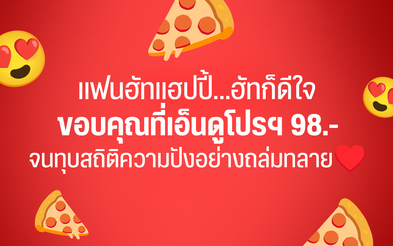 ขณะเดียวกัน Pizza Hut ก็โพสต์ข้อความว่า “ขอบคุณที่ซัพพอร์ต โปร 98 อย่างท่วมท้น ❤️ หากผิดพลาดประการใดไปฮัทขอน้อมรับและปรับปรุงพัฒนาให้ดีขึ้นในโอกาสต่อไป สุดท้ายขอบคุณพี่ ๆ น้อง ๆ พนักงาน ที่ตั้งใจเสิร์ฟความสุข ❤️ แล้วเจอกันโปรฯ ถัดไปนะฮัท”